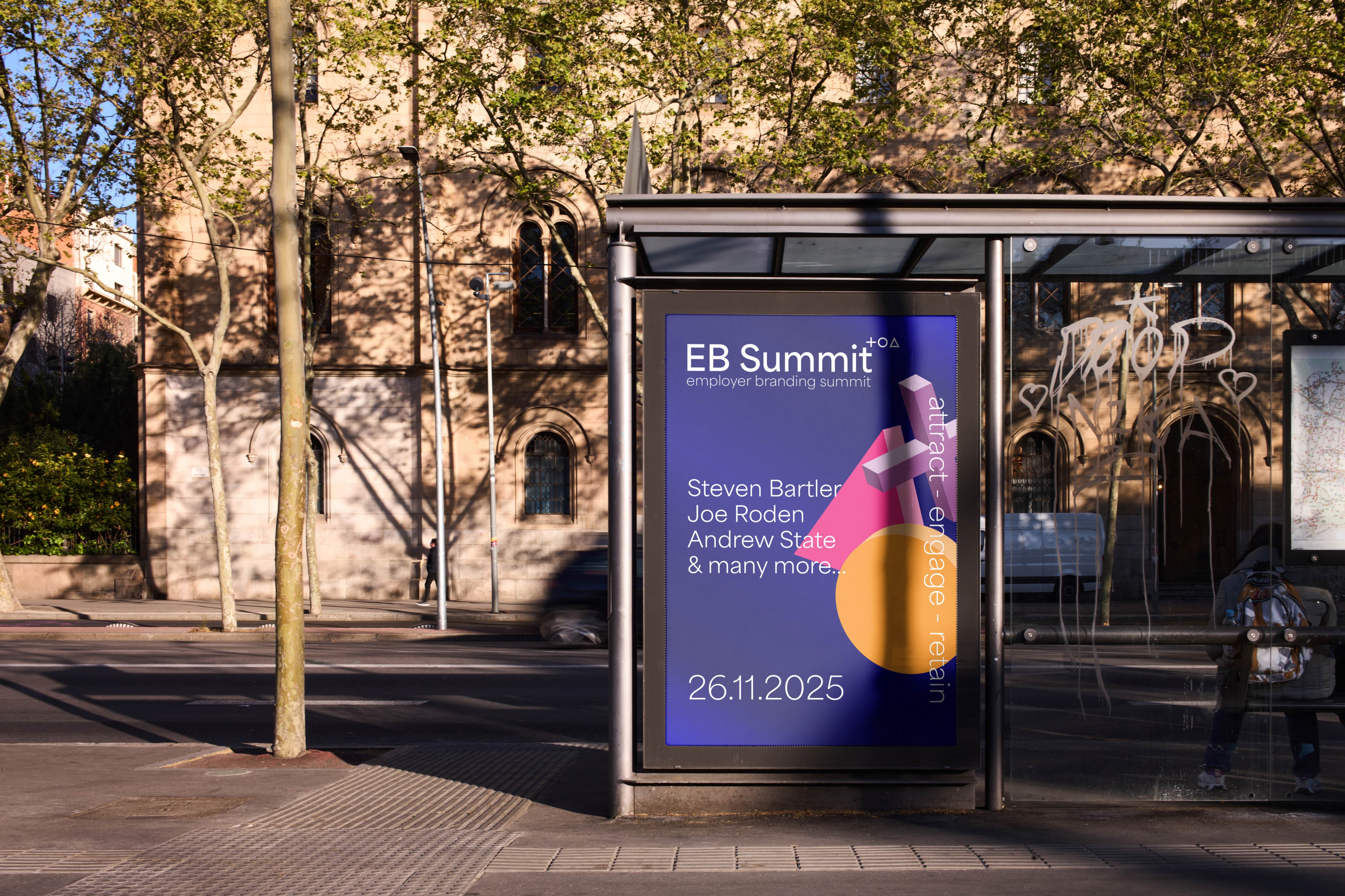 Визуална идентичност и бранд система за събитие в сферата на employer branding, с фокус върху ангажираност, динамика и яснота. Дизайнът обхваща дигитални платформи, събитийни материали и външна реклама.